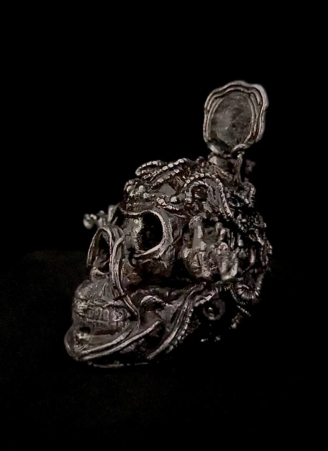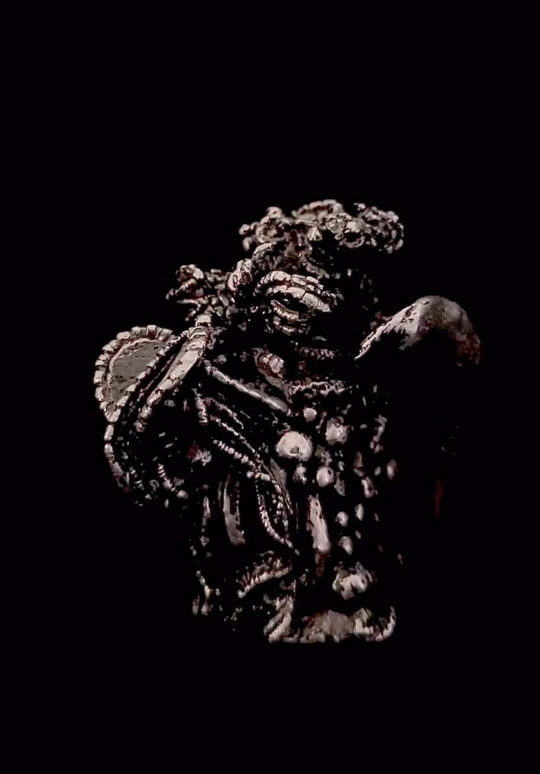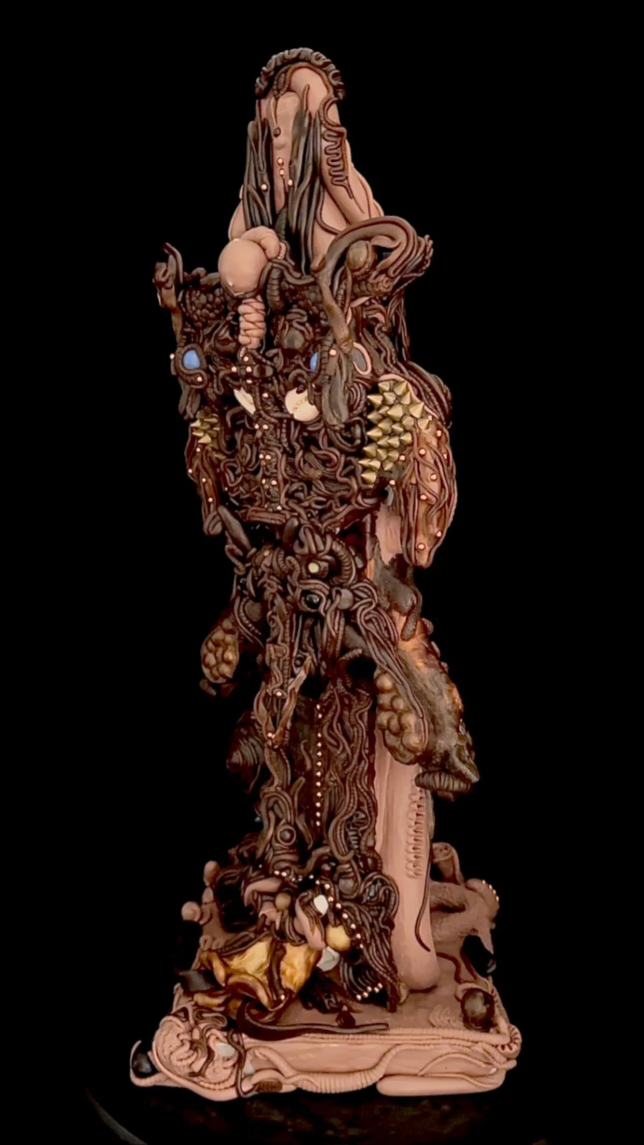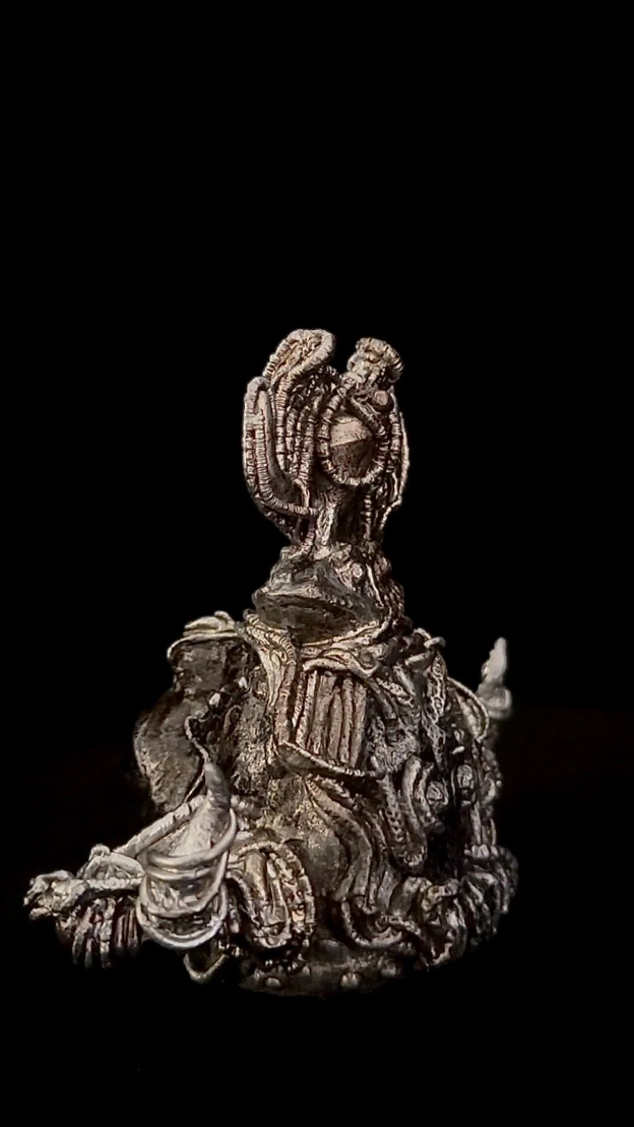 Pewter is ancient, in so far as being a casting alloy, a 2000+ year old tradition, though used sparingly in the realm of Fine Art. I cast this after a smaller sculpture-test-pour that went very well (‘Seed Chieftain Totemic’). With that success I went for it, knowing that if I could cast this, I could cast any sculpture I've ever made since 2013: this sculpture has 12 separate molds that ultimately come together to form it. Pewter has been mainly utilized for utilitarian decor/miniatures/fantasy figurines and never really taken to large scale sculpture. All my sculptures have an archival seal, so the patination/finish is locked in.